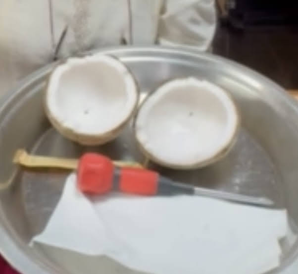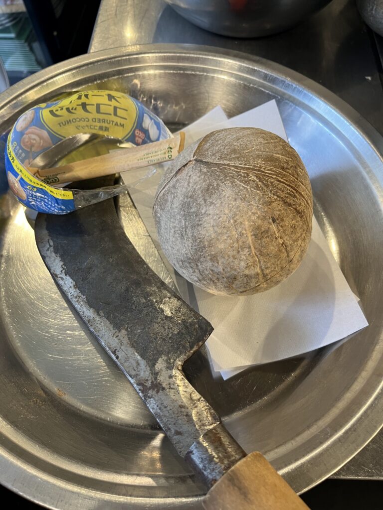 レッスンでは、オールドココナッツをなたで割り、インドから持ってきたココナツ削り器でシャリシャリと削り、ココナッツミルクを絞る体験をして頂きました。